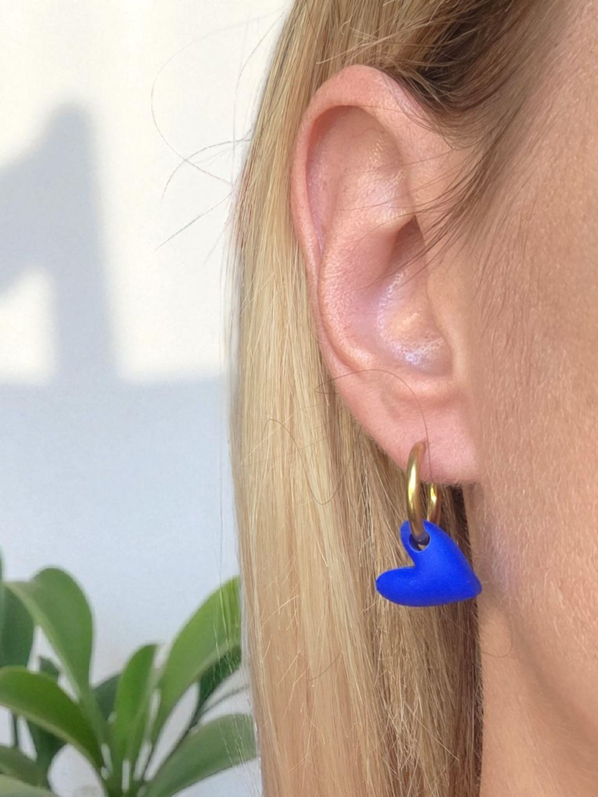 El protagonista de estos pendientes es un colgante en forma de corazón en tono azul mate, con textura suave y acabado tridimensional. Su forma redondeada y su color vibrante aportan frescura y personalidad, mientras que el aro dorado de acero inoxidable añade un contraste elegante y atemporal.