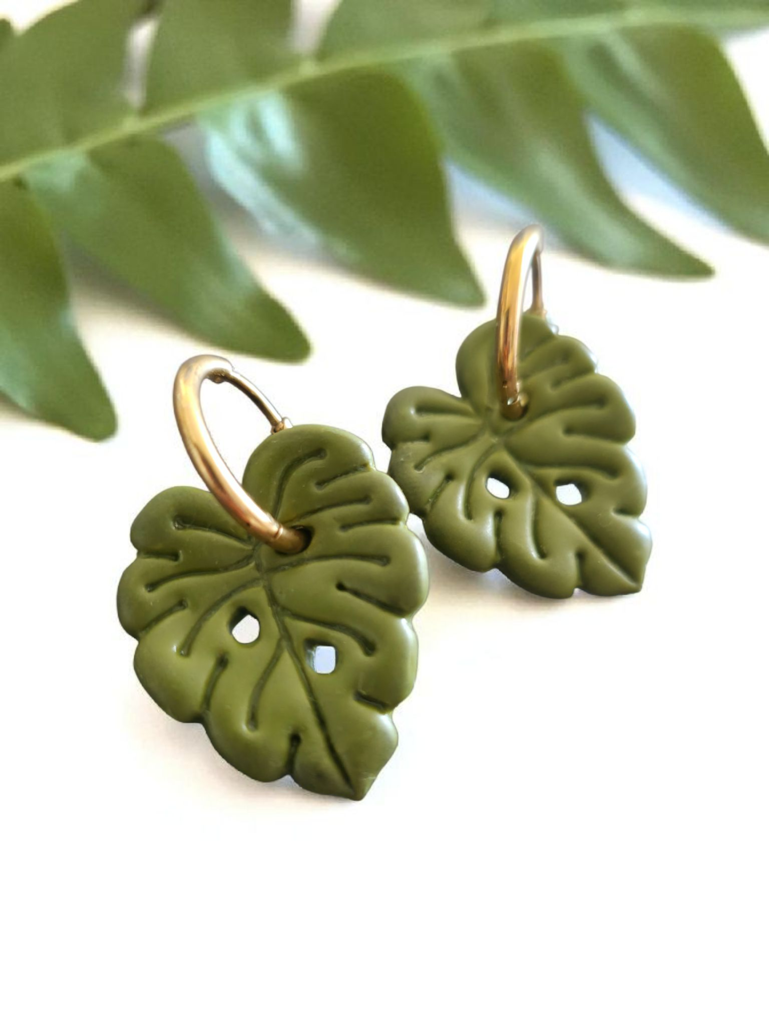 Con un diseño inspirado en la selva tropical, estos pendientes verdes con aro dorado transmiten frescura y estilo. Su forma de hoja de monstera es tendencia en moda y decoración, lo que los convierte en un accesorio atemporal y lleno de personalidad.