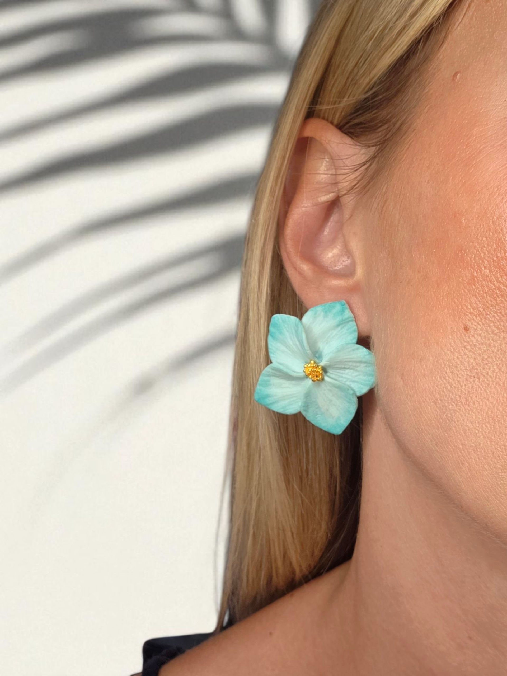 Estos pendientes de flor turquesa evocan el frescor del mar y la calma de los días soleados. En algunas culturas se dice que el color turquesa atrae la suerte y la abundancia. Así que aparte de ser un complemento ideal, te traerá buena suerte