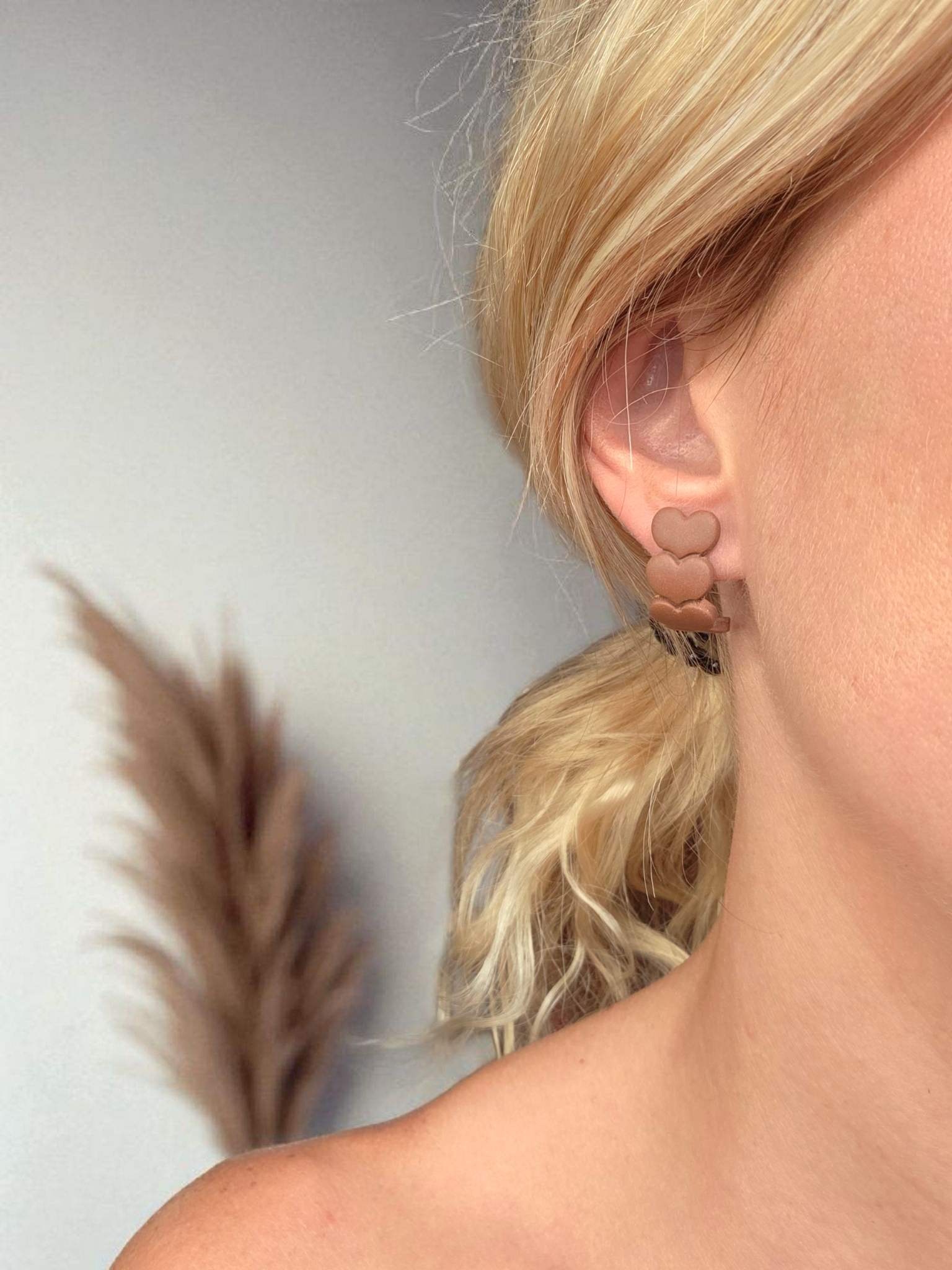 Nuestros pendientes de corazones beige están elaborados artesanalmente con arcilla polimérica ligera y resistente, lo que los convierte en el complemento perfecto para el día a día. Su diseño minimalista de tres corazones alineados en tono neutro combina fácilmente con cualquier estilo, desde looks casuales hasta outfits más elegantes.